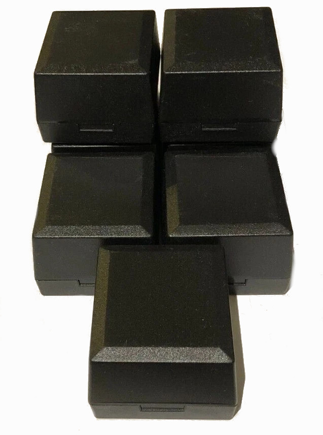 Black Plastic Ring Box. Quality hard plastic wholesale hinged gift display ring boxes manufactured in black coloured plastic. approx 30mm x 45mm size. Includes foam insert pad to display ring.