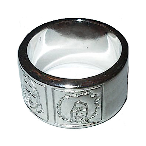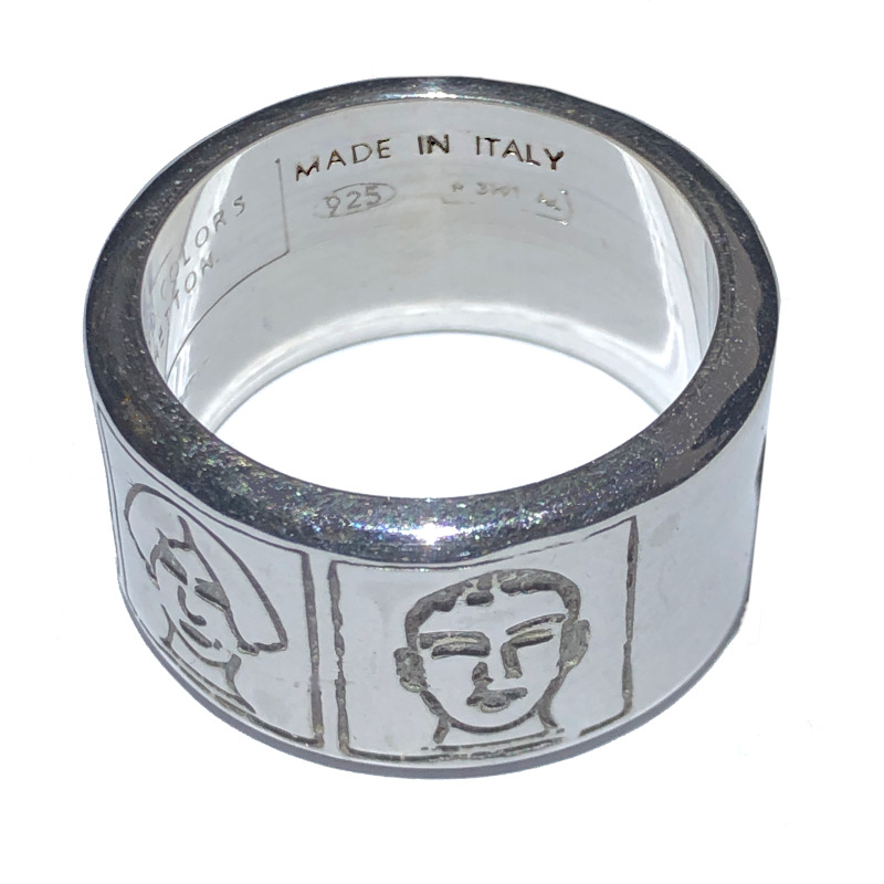 Sterling Silver Heavy Ring in the many faces design showing five different faces around a wide band by United Colors of Benetton. Many Faces designer ring with United Colors of Benetton logo on engraved inside the ring band and five various Faces around the heavy 11mm wide Band 925 Sterling Silver Ring.